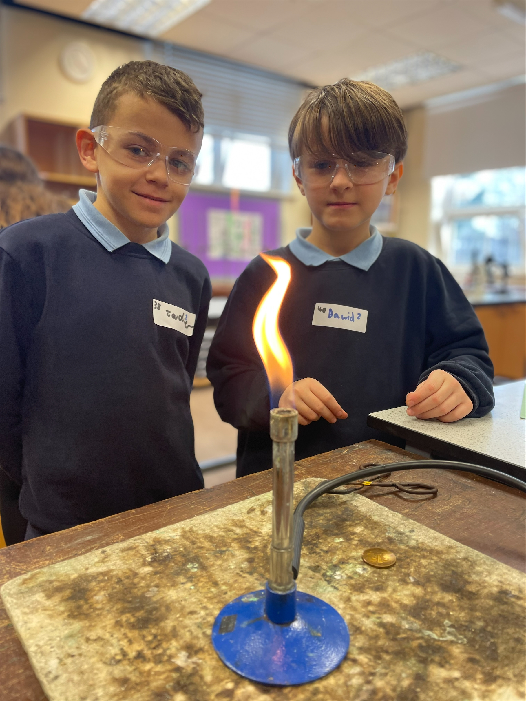 They made Christmas trees under the microscope using a chemical reaction to copper, turned 2p pieces silver and then gold with zinc, electricity and then the bunsen burners and found the optimum mass to pop a party popper.