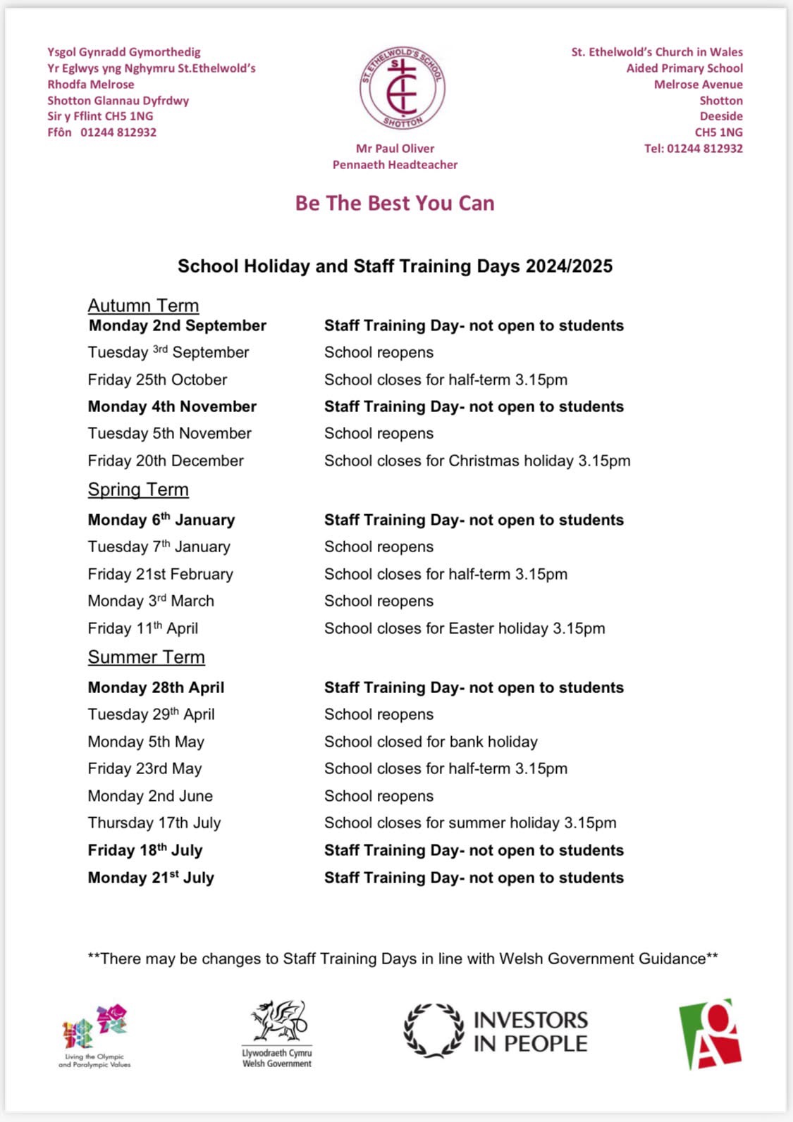 **There may be changes to Staff Training Days in line with Welsh Government Guidance**